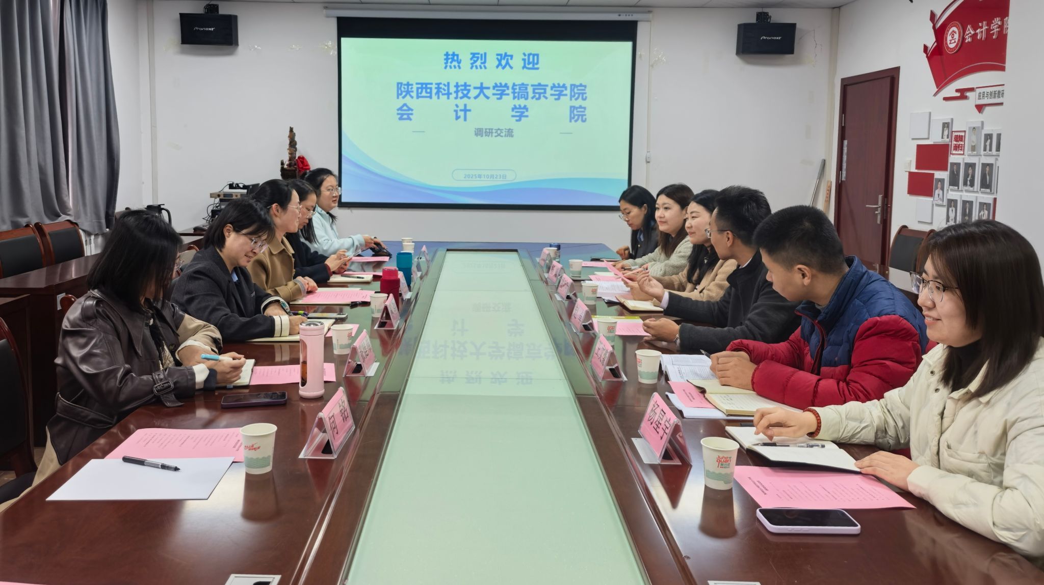 为深化会计类专业建设,优化人才培养体系,加强高校间教育教学经验交流,10月23日下午,陕西科技大学镐京学院会计学院院长赵卓带领会计系主任姚叶叶、大数据与会计教研室主任王文豪等一行6人,赴我校会计学院开展调研交流活动。调研会在知信楼4120会议室召开,会计学院副院长韩磊、审计与资产系主任张健维、会计学教研室主任刘溶及2位骨干教师参加出席,会议由代理副院长崔晓会主持。